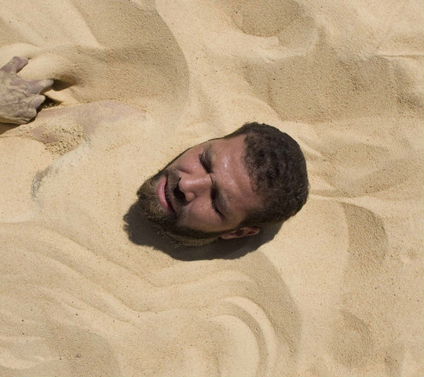 Mohmmed Emad, 41, nằm chôn thân thể trong một bãi cát ở vùng núi El Dakrror, Ai Cập. Người ở làng Siwa tin rằng chôn mình dưới cát vào thời điểm nóng nhất trong ngày có thể chữa được bệnh thấp khớp và ngay cả bệnh liệt dương. |
