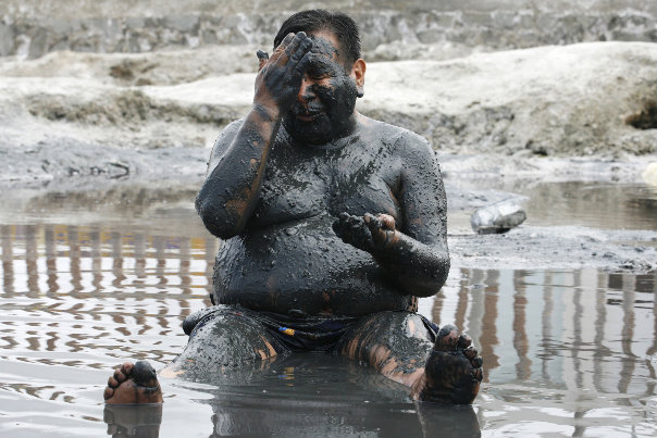 Một người đàn ông tắm bùn ở hồ "phép lạ", tỉnh Chila, Peru. Hồ phép lạ có màu bùn xanh rêu đặc trưng được cho là có thể chữa bá bệnh. |