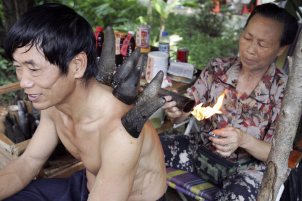 Giác hơi bằng sừng trâu, một kiểu chữa bệnh cảm cúm phổ biến hơn 2,500 năm ở Nam Ninh, Trung Quốc. |