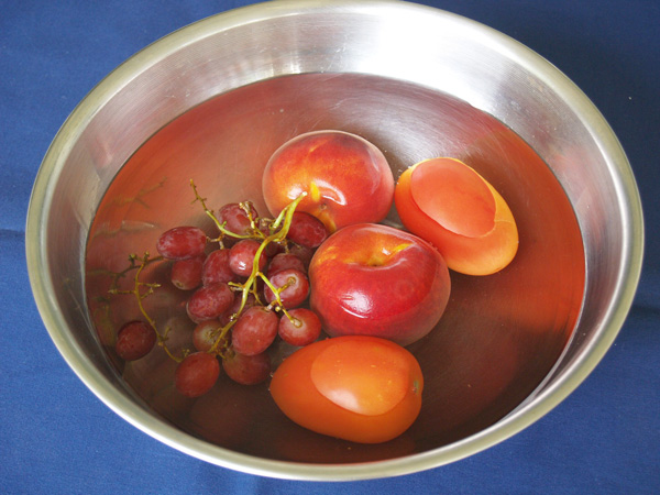 Sau đó, ngâm rau củ và trái cây vào dung dịch này và giữ nguyên hỗn hợp trong vòng 15 phút. Sau cùng, dùng khăn lau khô trái cây là có thể dùng được. Đối với các loại rau, chỉ nên ngâm hỗn hợp trong vòng 5-7 phút rồi rửa lại với nước sạch.