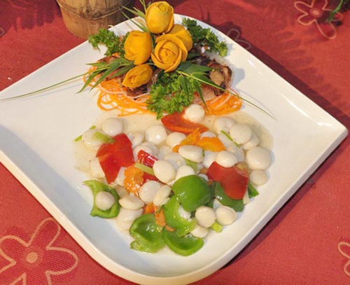 - Bắc chảo lên bếp, đun nóng dầu ăn, phi thơm tỏi, cho ngô hạt vào xào sơ, cho tiếp đậu Hòa Lan, ớt khô, nấm vào xào, nêm nước dùng, xào chín, cho sò điệp chiên vào đảo đều lên, bày ra đĩa. Ăn nóng.
