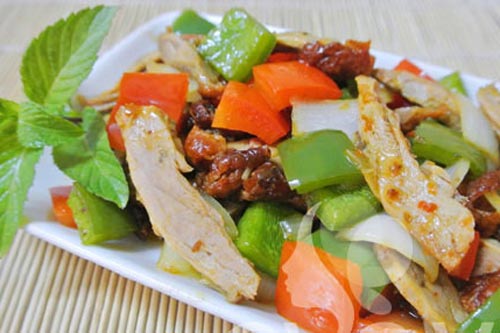 Thịt vịt quay; Ớt chuông xanh, đỏ; Hành tây; Dầu hào; Sa tế; Tương ớt.