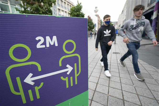 Bảng nhắc nhở người dân thực hiện giãn cách xã hội phòng lây nhiễm COVID-19 tại Liverpool, Anh, ngày 2/10/2020. Ảnh: THX/TTXVN