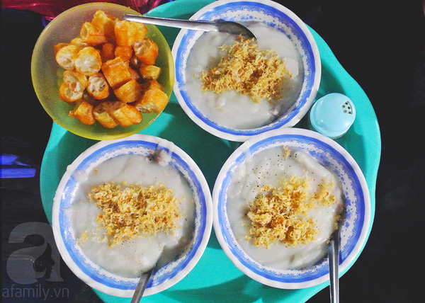 Cháo đậm vị từ nước hầm xương ăn cùng ruốc và quẩy nóng giòn rất hấp dẫn.