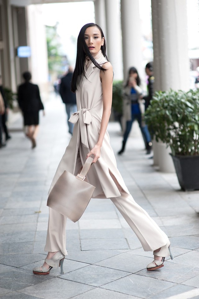 Bộ cánh đầu tiên có gam màu trắng kem, đường cắt thanh thoát. Thiết kế dạng suits phù hợp vóc dáng mảnh mai của người mặc. Người mẫu Next Top Model phối giày và túi xách ton sur ton.