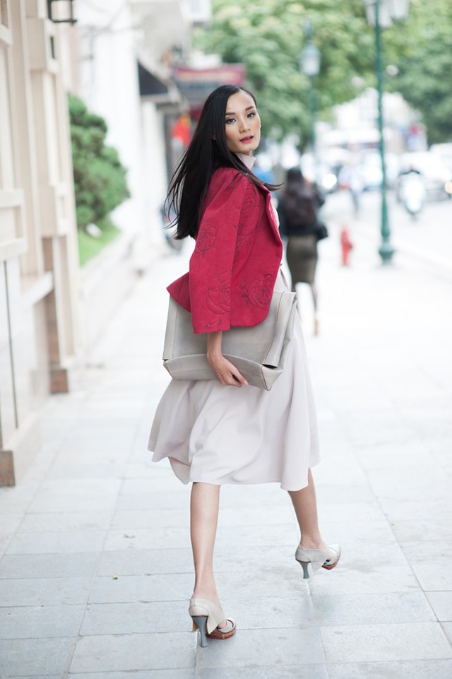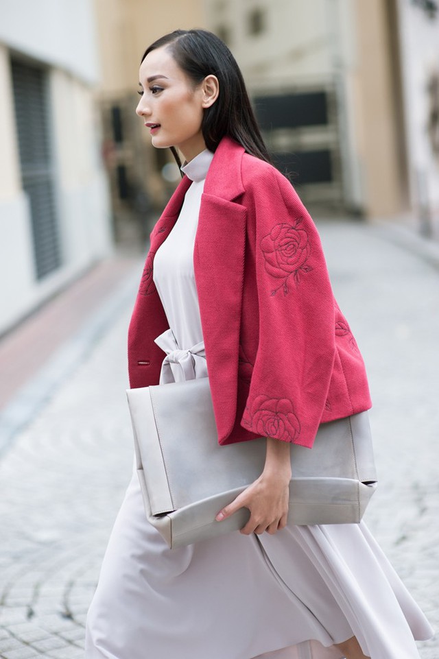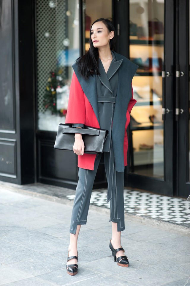 Trang phục nhiều lớp phù hợp với bạn gái có dáng mảnh như Lê Thúy. Bộ cánh trong ảnh vận dụng gam màu tối, áo khoác đỏ bắt mắt làm điểm nhấn. Clutch hiện đại đồng điệu cùng set đồ.