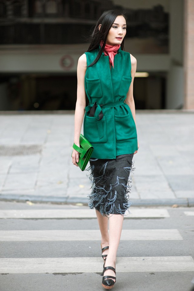 Vest không tay, màu sắc tối giản phối cùng trang phục thanh lịch là gợi ý của chân dài Next Top Model dành cho các cô nàng dáng mảnh.