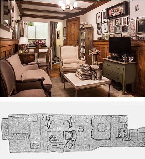 Căn hộ rộng 90m2 này dường như có nhiều không gian hơn nhưng tất cả các không gian đều được sử dụng với một quầy bar nhỏ khiến căn bếp trông rộng hơn, một phòng ngủ, phòng khách với bàn nhỏ và ghế sô pha. Những chiếc sô pha đơn khiến mọi thứ trông vùa vặn và tận dụng được đặc điểm hẹp và sâu của căn nhà. Tấm thảm đồng màu với sopha giúp chia cách không gian phòng khách và các phòng khác.