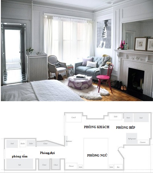 Trên đây là căn nhà nhỏ của Linsey- một cư dân thành phố với kết cấu điển hình ở New York. Đặt giường và ghế sofa dựa vào những bức tường đối diện nhau đã tạo ra sự phân biệt giữa phòng ngủ và phòng khách ngay trong một không gian. Một góc làm việc cũng khéo léo được tạo ra ngay phía trái cạnh giường ngủ.