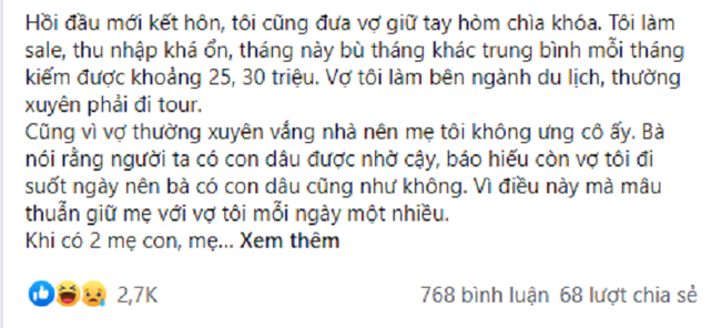 Cũng vì vợ thường xuyên vắng nhà nên mẹ tôi không ưng cô ấy. Bà nói rằng người ta có con dâu được nhờ cậy, báo hiếu còn vợ tôi đi suốt ngày nên bà có con dâu cũng như không. Vì điều này mà mâu thuẫn giữ mẹ với vợ tôi mỗi ngày một nhiều.