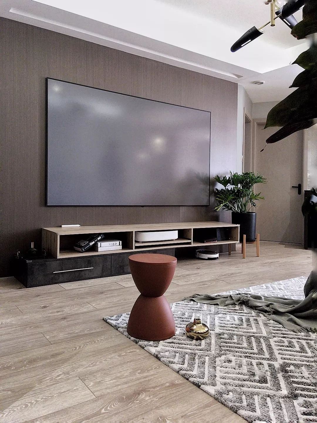 Vì kích thước căn hộ không vuông vắn nên mọi góc nhỏ gần tường đều được tính toán kỹ lưỡng nhằm mang lại vẻ đẹp thanh thoát, toàn diện cho không gian, đồng thời giúp tổ ấm trở nên hữu ích hơn khi tận dụng đúng cách. Bức tường nhỏ gần kệ tivi được dán giấy dán tường cùng màu và họa tiết với bức tường phía sau sofa. Bức tường ấy cũng trở nên hữu ích hơn khi được đặt vừa vặn chiếc đàn piano.