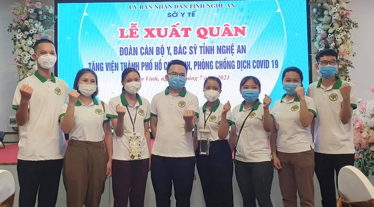 Trong 60 bác sĩ, điều dưỡng và kỹ thuật viên chi viện cho TP HCM đợt này có có 31 nữ. Họ là những cán bộ y tế đang công tác tại các bệnh viện lớn của tỉnh như: Bệnh viện Hữu nghị Đa khoa Nghệ An, Bệnh viện Sản Nhi Nghệ An, Bệnh viện Nội tiết, Bệnh viện Phổi Nghệ An, Bệnh viện Đa khoa TP Vinh… và các Trung tâm y tế của các huyện trên địa bàn.