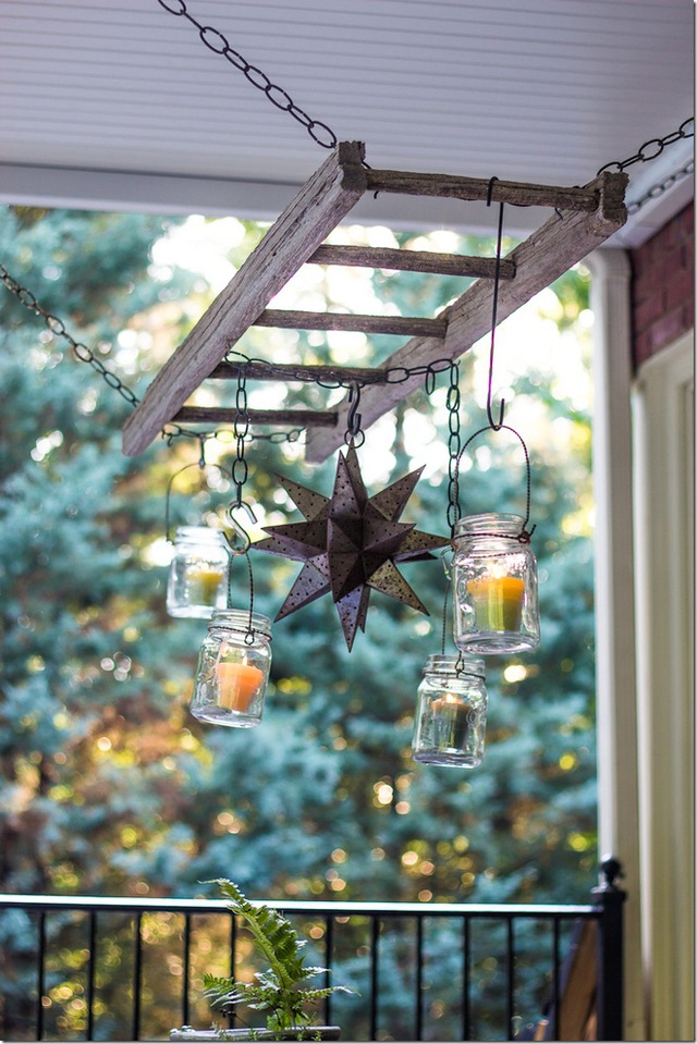 7. Và cuối cùng, một mẫu đèn chùm độc đáo mà chúng tôi không thể bỏ qua đó là mẫu làm từ một thang gỗ cũ. Trong đó, 4 đầu thang gỗ cột xích giăng lên trần nhà. Sau đó, phần thân thang gỗ đính các sợi xích, dây móc kim loại cột các hũ thủy tinh trong suốt, bên trong đặt các ngọn nến nhiều màu sắc khác nhau.