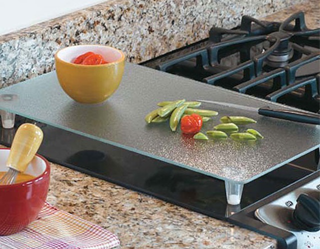 Thớt thủy tinh có kích cỡ vừa vặn với góc bếp, đặt cố định ở vị trí này không chỉ tiện lợi cho việc cắt gọt đồ ăn mà còn giúp không gian bếp trở nên sang trọng hơn. Thớt thủy tinh cường lực này cho bạn cảm giác vô cùng yên tâm khi chặt đồ hay đặt xoong nồi vừa nấu chín ở nhiệt độ cao và cùng dễ dàng cọ rửa khi sử dụng xong.