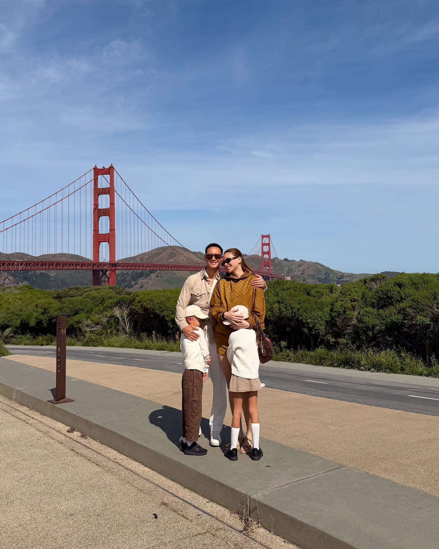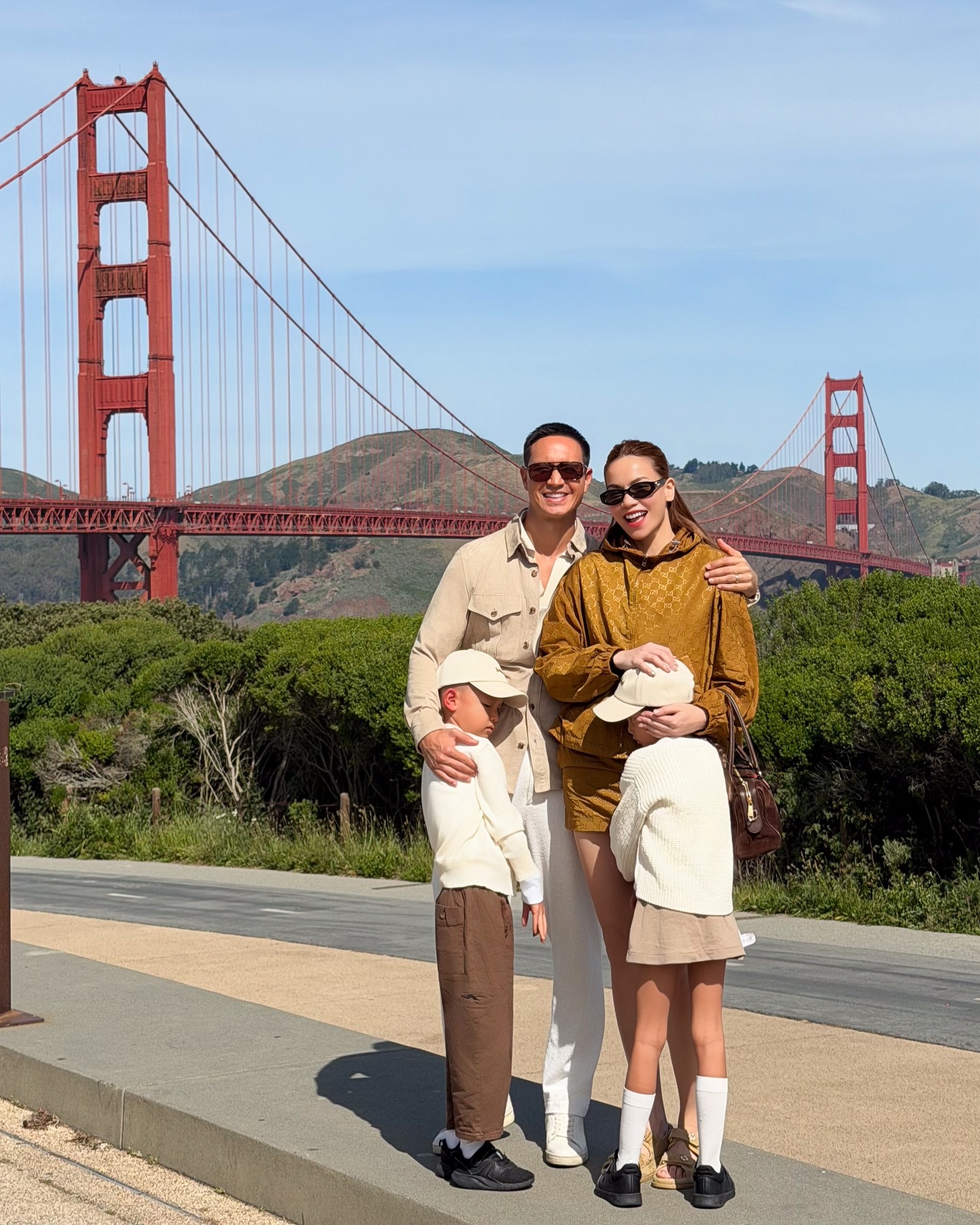 Kim Lý đã viết về khoảnh khắc tại Mỹ: "Chuyến đi đầu tiên chúng tôi cùng nhau thực hiện là tại Cầu Cổng Vàng. Ai có thể nghĩ rằng gần 9 năm sau, chúng tôi lại quay trở lại đây, lần này cùng hai ‘viên ngọc quý’ xinh đẹp của mình".