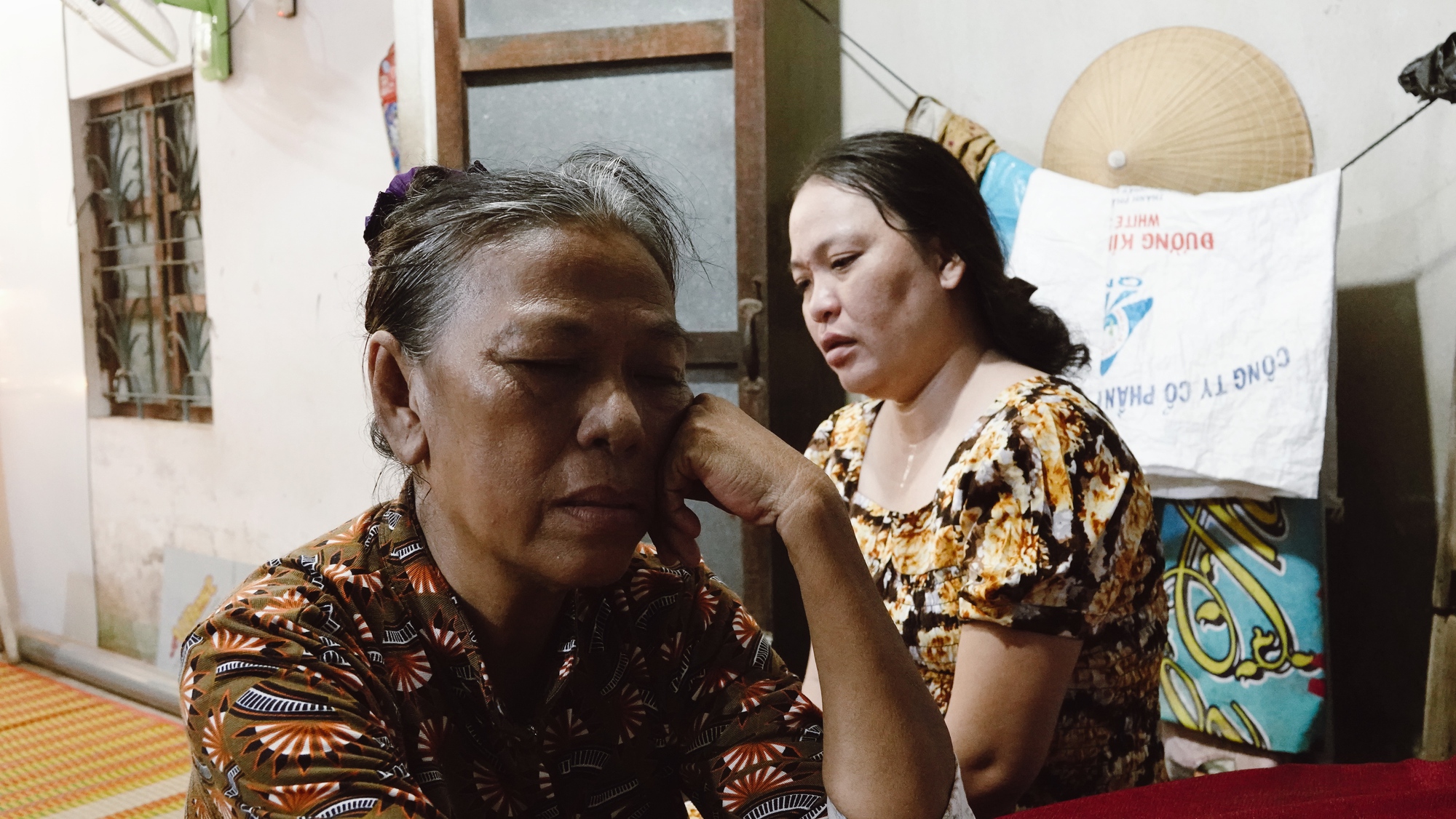 "Mười mấy tuổi là ổng đi biển tới giờ, năm nay ổng lớn tuổi rồi biểu ổng ở nhà mà ổng không chịu, ổng nói nhà khổ quá ổng đi kiếm tiền", bà Cang nhớ về những ngày trước khi chồng đi theo tàu, nước mắt lã chã rơi.