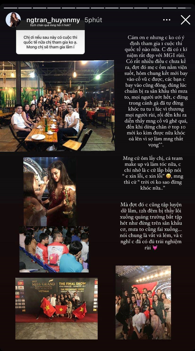 Huyền My khẳng định sẽ không tham gia thêm một cuộc thi nhan sắc quốc tế nào nữa vì cô đã có trải nghiệm tại Miss Grand International 2017. Nàng Hậu cũng tiết lộ luôn những câu chuyện chưa ai biết trong quá trình Huyền My dự thi và dẫn đến hình ảnh cô bật khóc nức nở trong đêm chung kết năm đó.