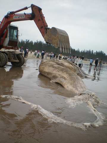 Máy xúc được huy động để đưa xác cá voi đi chôn cất |