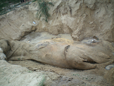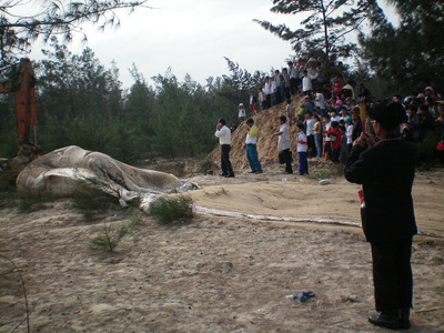 Đến 15h, cùng ngày xác con cá voi được chính quyền xã mai táng ngay trên bãi biển gần đền thời Cá Ông. |