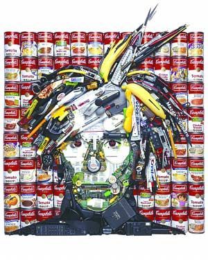 Ông bầu nổi tiếng của dòng nhạc classic rock thập niên 60, Andy Warhol được "vẽ" bằng những vật dụng như chiếc điều khiển, quả chuối... trên nền những hộp súp Campbell. |