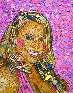 Nghệ sĩ hài kịch Chris Rock trông thật nam tính trên bức tường gạch. Mecier đã “trang điểm” cho chân dung của Chris bằng rất nhiều hộp lọ, cũ, điều khiển tivi, bút chì và tất nhiên là không thể thiếu đĩa DVD bộ phim Pootie Tang có sự góp mặt Chris Rock. |