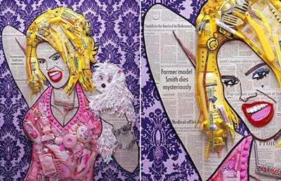 "Quả bom sex" đã quá cố Anna Nicole Smith được dựng chân dung bằng chính bài báo viết về cái chết bí ẩn của cô, bên cạnh những đồ chơi màu hồng ấn tượng. |