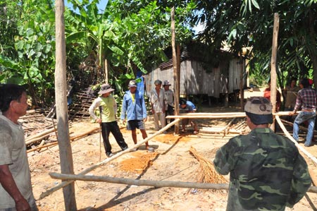 Người dân xã Trà Đốc giúp nhau dựng nhà gỗ ở tạm. Ảnh: Đ.H |