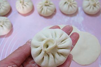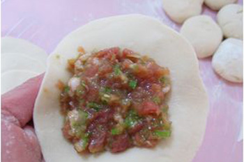 Bước 3: Khi bột nở to, lấy ra nhào lại cho mịn, sau đó chia thành các phần nhỏ. Cán cục bột nhỏ thành hình tròn, có phần giữa dày hơn so với viền. Sau đó cho một ít nhân vào giữa.