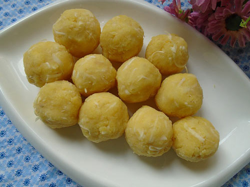 Bước 3: Đỗ xanh cà vỏ vo sạch, ngâm nước qua đêm hoặc ngâm khoảng 3-6h, đem hấp chín rồi nghiền nhuyễn, trộn với khoảng 3 thìa đường, ít dừa nạo rồi viên thành từng viên nhỏ.