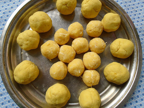 Bước 4: Phần bột sau khi nhào kỹ, viên thành từng viên tròn, sau đó ấn dẹt, đặt viên nhân đỗ xanh vào rồi viên tròn lại. Làm như vậy cho đến hết phần nguyên liệu.
