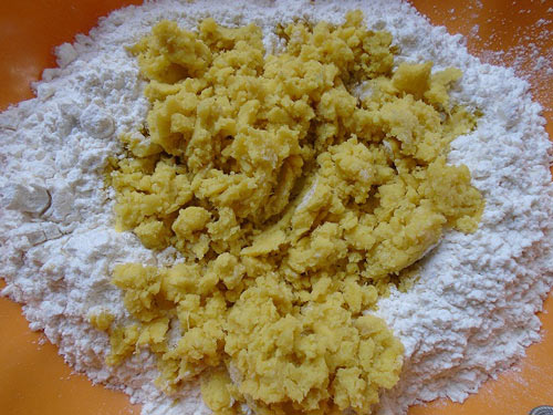 Bước 2: Bột mỳ đổ ra thố sạch, trộn bột mì với khoai lang, 1 ít sữa đặc, 1 ít đường, sữa tươi và nước sau đó nhào kỹ đến khi thành một khối không dính tay (khi cho sữa, đường tùy theo sở thích để cho độ ngọt nhé)