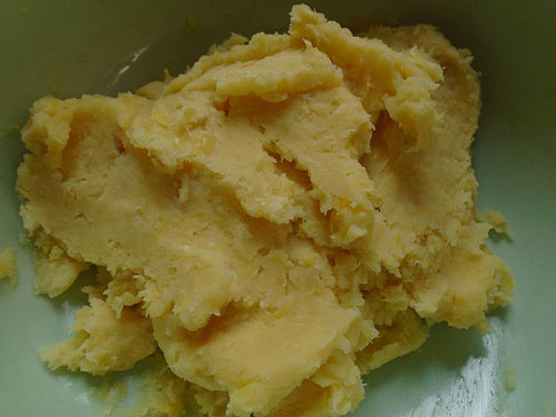 Bước 1: Khoai lang rửa sạch, hấp hoặc luộc chín. Khi khoai vẫn còn nóng, bóc vỏ, nghiền nhuyễn.