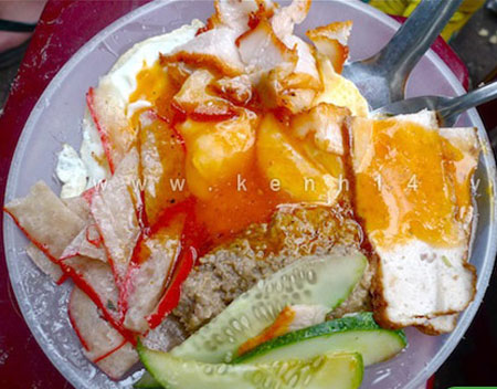 Còn món bánh mì trứng thì phổ biến nhất vẫn là loại bánh mì ăn kèm trứng ốp và các loại nhân khác như thịt xá xíu, pate, chả và xúc xích. Bánh mì trứng ở đây khác những nơi khác là họ sẽ dọn tất cả những thứ trên vào một đĩa nhựa nhỏ và kèm theo 1 chiếc bánh mì nóng giòn. Bạn có thể gọi 1 đĩa chỉ có trứng không, hoặc thêm 1 trong số các loại nhân kia, hoặc tất cả. Bác bán hàng sẽ hỏi thêm bạn muốn ăn trứng rán non hay già. Lời khuyên nhé, hãy ăn món bánh mì này với trứng rán non lòng đào.