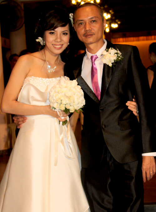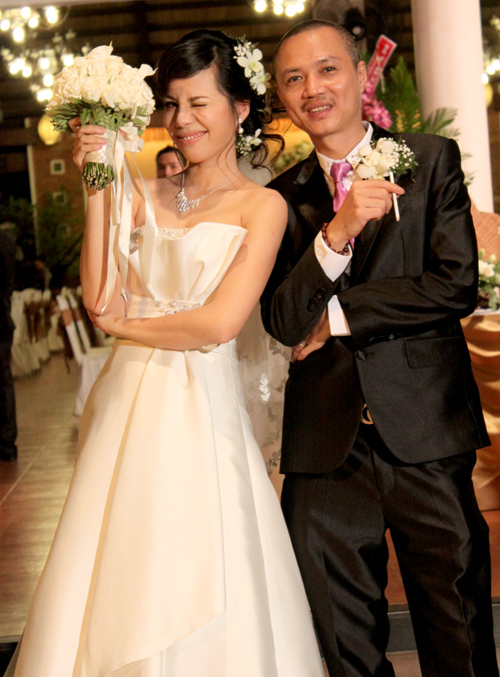 ![]() Nữ diễn viên “Hoa dã quỳ” rạng rỡ bên chú rể Võ Tấn Bình trong ngày cưới. Ngay từ đầu, chàng đạo diễn đã cố tình chọc cười khách mời khi diện trang phục vest đi kèm chiếc cà vạt màu tím nhìn rất “sến” và “bóng” |