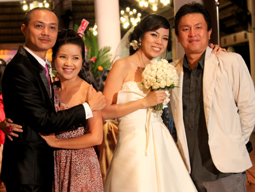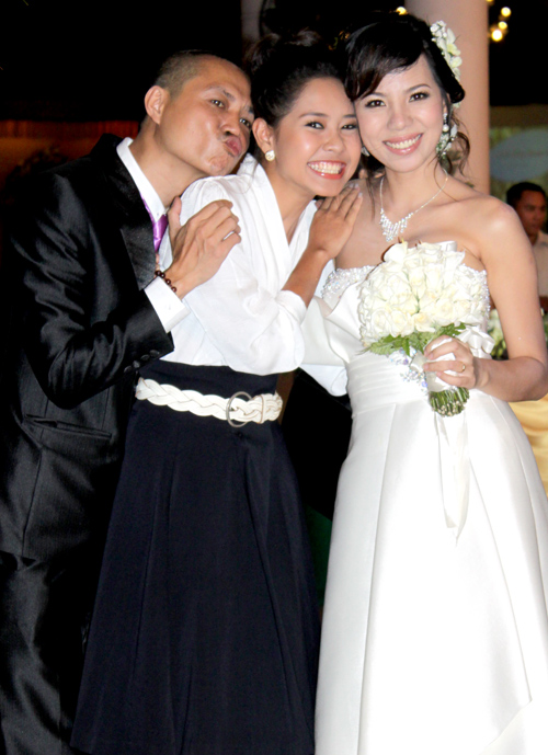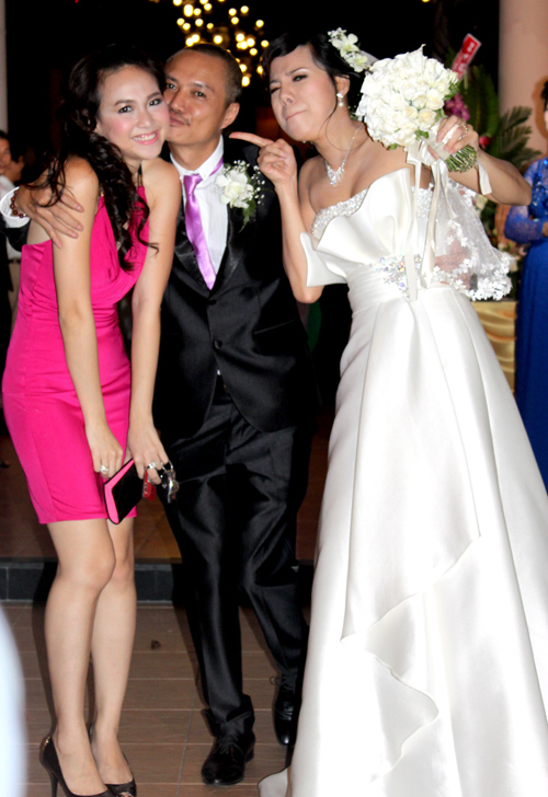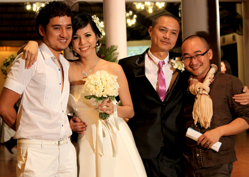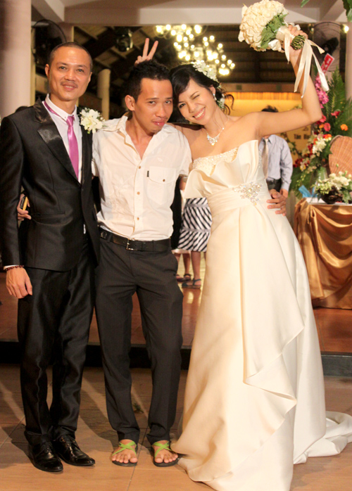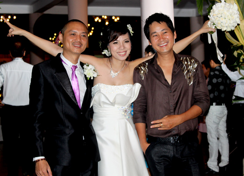 ![]() Trong khi cô dâu tình tứ, thân mật cùng đạo diễn Duy Băng (trái) thì chú rể Tấn Bình cũng tranh thủ “ôm” stylist Vô Thường (phải). |