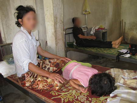 Mẹ con chị Vũ Thị Tuyết tại khoa Ngoại Tổng hợp Bệnh viện Đa khoa Hương Khê, Hà Tĩnh. |