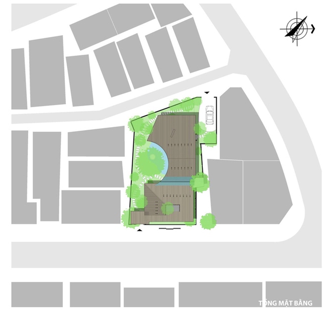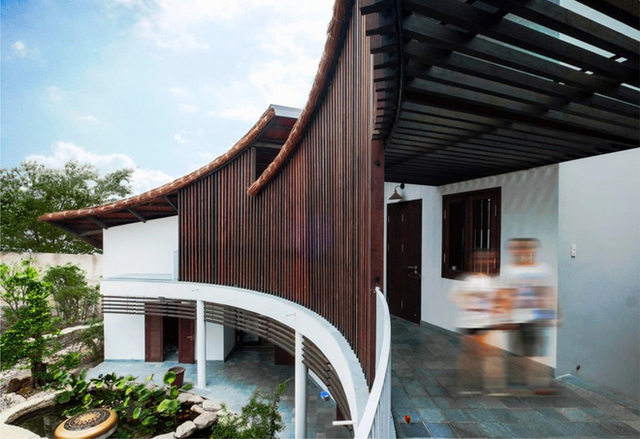 Hành lang cong mềm mại ôm lấy khoảng sân trong xanh mát với mặt nước và cây cảnh bố trí linh hoạt.