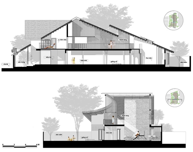 Các phòng được che chắn bởi mái vọt và hệ lam gỗ. Tường bao che hai lớp, giữa có lớp xốp cách nhiệt.