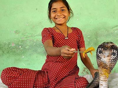 Bé Kajol Khan 8 tuổi ở Ghatampur, Ấn Độ rất thích chơi với rắn hổ mang chúa - mà em gọi là những người bạn thú của mình. Thay vì chơi với búp bê, cô bé đã có 6 con rắn hổ mang và em cho chúng ở trong phòng mình, bất chấp việc nọc độc của chúng có thể giết chết tới 40 người.