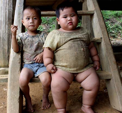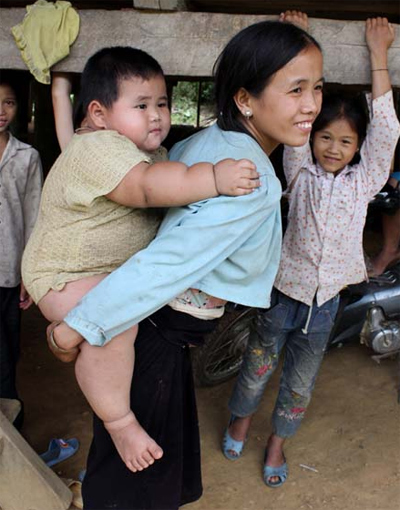![]() Bé Xa Hồng Anh (phải) mới 2 tuổi nhưng nặng gấp 2,5 lần cậu anh lên 5 tuổi. Ảnh: VTC. |