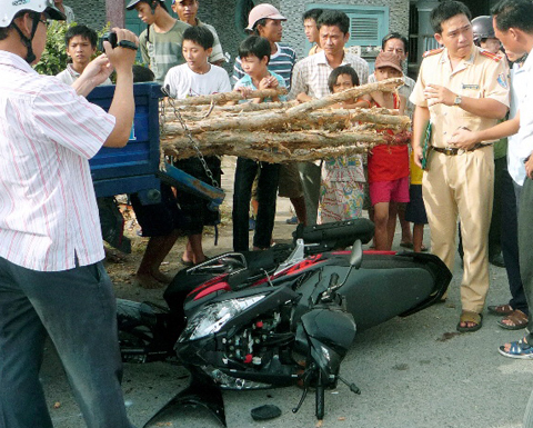 Không xử lý kịp khi chạy sau ôtô chở cây cừ tràm, anh Hiển đã tông thẳng vào đuôi xe và bị cây đâm thủng bụng.