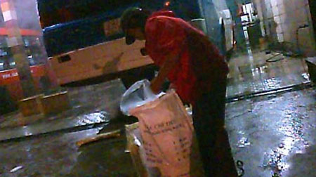 ![]() Nghĩa - người làm công cho ông Tuấn “dồi trường” - nhận lòng heo thối tại bến xe “cóc” ở khu vực cầu vượt Sóng Thần - Ảnh chụp từ camera |
