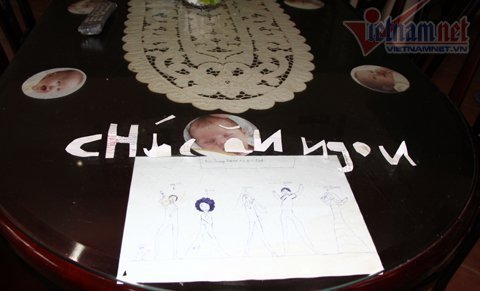 Chiếc bàn ăn được cậu em của Huyền My trang trí rất ngộ nghĩnh với lời "Chúc ăn ngon" được xé bằng giấy kèm với bức tranh vẽ tất cả các thành viên trong gia đình. |