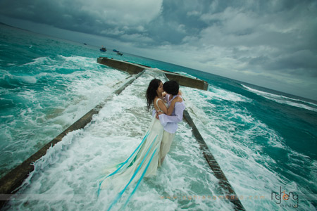 Cô dâu - cô con gái duy nhất của nghệ sĩ Hồng Sơn cùng chú rể và cả đoàn thực hiện bộ ảnh cưới đã ra đảo đúng vào đầu mùa bão, biển động nên ai cũng ướt sũng sau mỗi pha bấm máy…