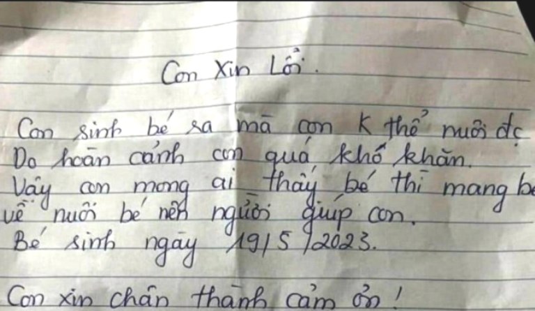 Nội dung lá thư viết: "Con xin lỗi. Con sinh bé ra mà con không thể nuôi được. Do hoàn cảnh con quá khó khăn. Vậy con mong ai thấy bé thì mang bé về nuôi bé nên người giúp con. Bé sinh ngày 19/5/2023. Con chân thành cảm ơn!".