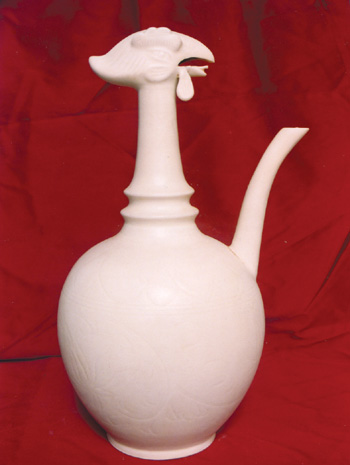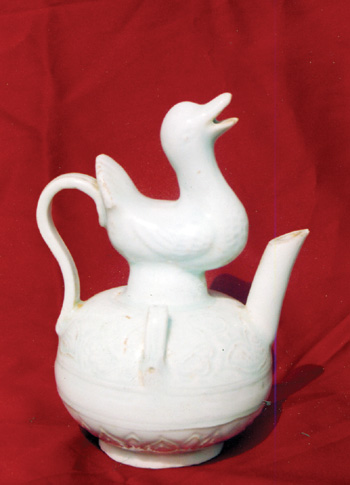Ấm gà thần bằng gốm trắng là chiếc ấm cổ nhất, có từ cuối thời Lý, đã gần 800 năm tuổi. |