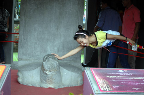 Mặc kệ lời nhắc nhở các sĩ tử vẫ sờ đầu rùa |