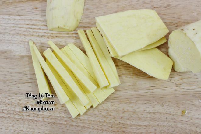 - Khoai lang rửa sạch, cạo vỏ, bào thành sợi hoặc cắt thành những miếng bản to.
