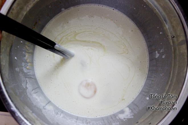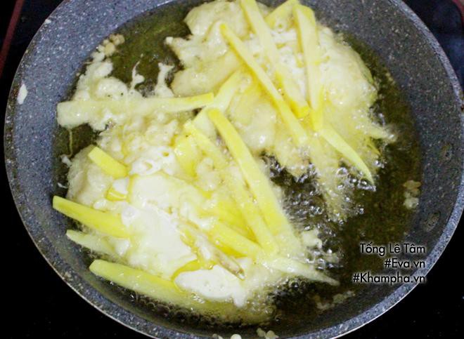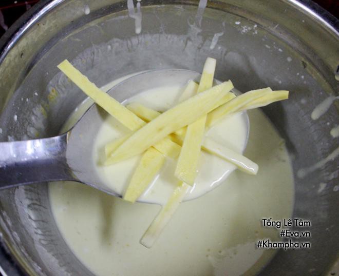 - Dùng một chiếc muôi cho khoai đã thái vào bột vừa pha lấy lượng bột vừa đủ.