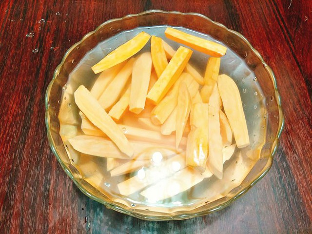 - Bước 2: Khoai sau khi đã thái xong thì ngâm ngay vào tô nước muối loãng 15 phút, vớt ra rửa lại cho sạch rồi để ráo nước.
